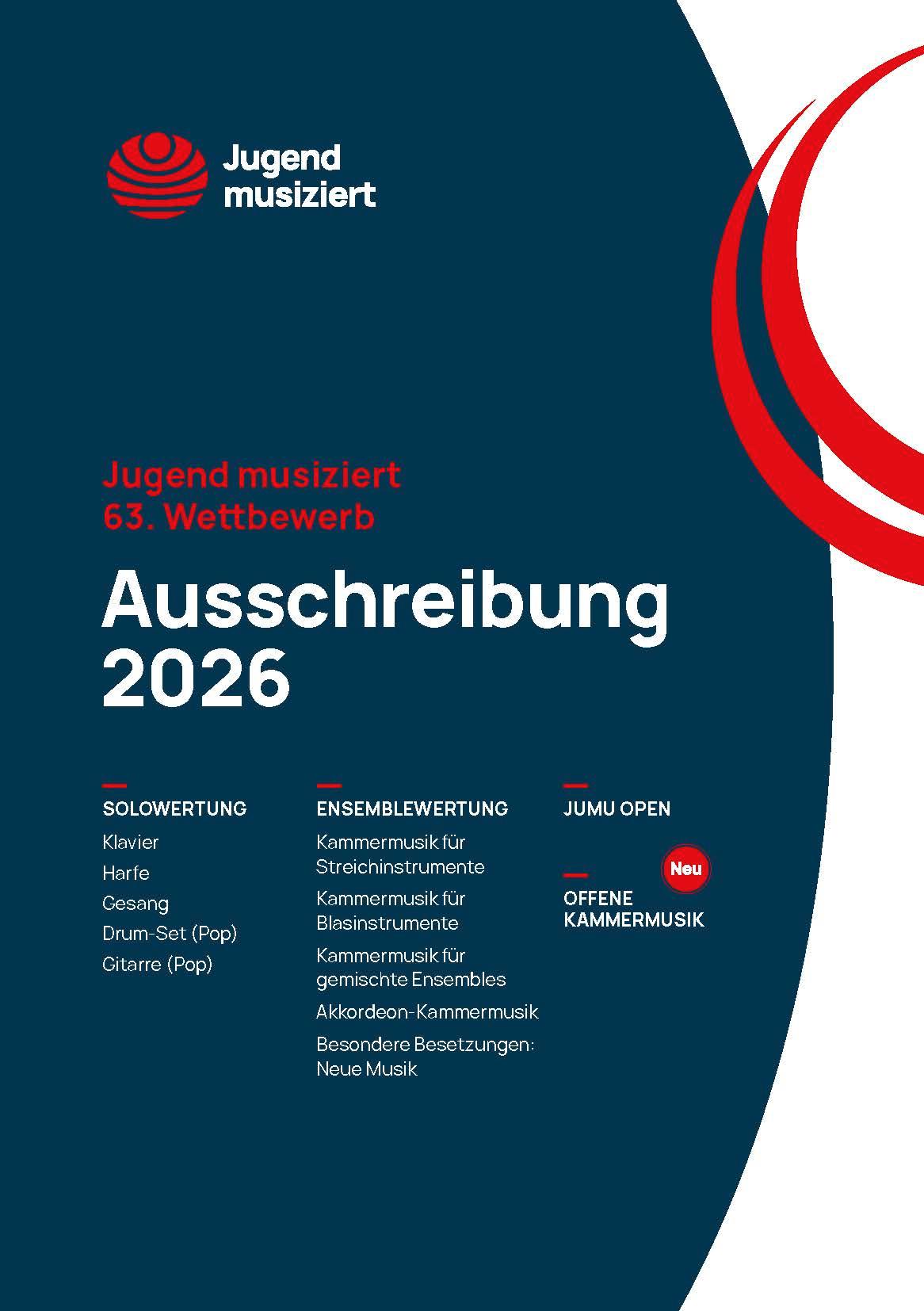 Mit der Ausschreibung Jugend musiziert 2026 starten wir in ein neues Jugend musiziert-Jahr. Die Anmeldung wird ab 1. Oktober 2025 bis 15. November 2025 über die Jugend musiziert-Website in Jumu Online möglich sein.